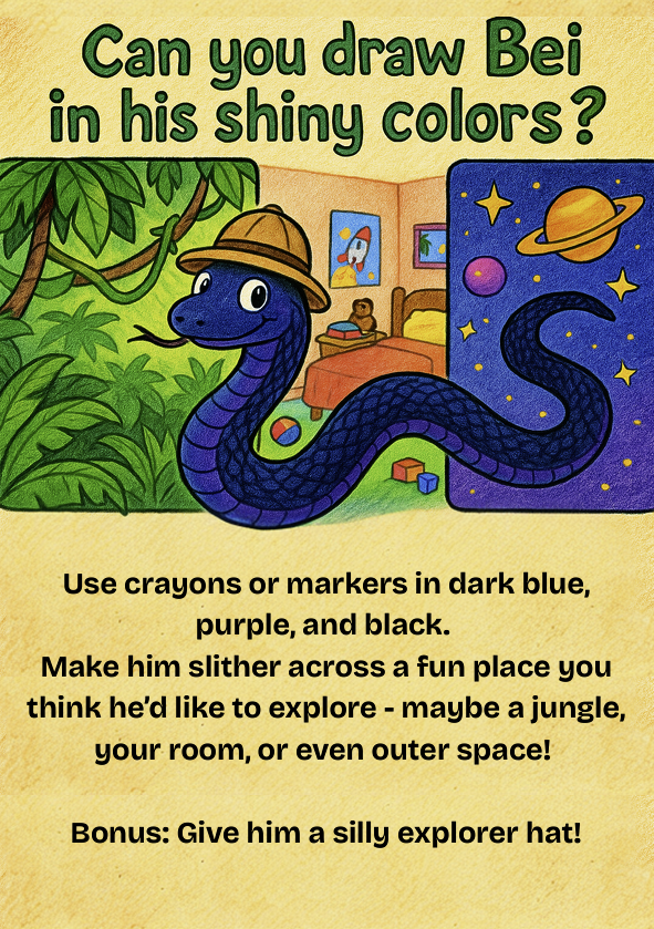 Bei is a shiny Eastern Indigo Snake—one of the kindest snakes you’ll ever meet. She’s 5 years old, super sweet, and loves to explore! When she slithers out of her home, it’s like she’s on a secret mission—checking out every nook and cranny.