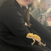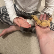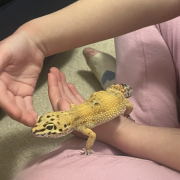 Lemon is a Leopard Gecko, and she’s one of the calmest, kindest reptiles you’ll ever meet! She loves spending time with her people and is super gentle when being held. You can let her walk across your hands, watch her climb to a cozy perch, or just relax with her while she warms up.